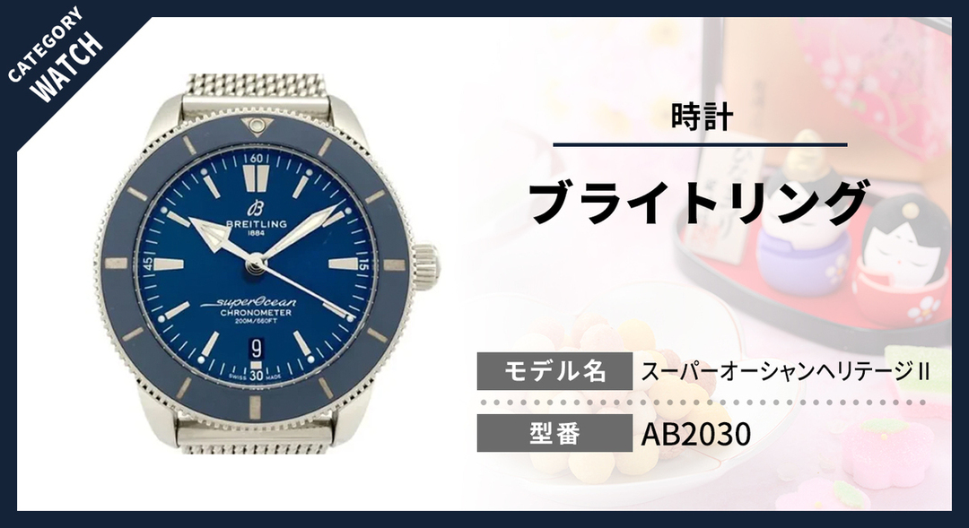 ◆注目される市場価値と需要 スーパーオーシャンヘリテージⅡは、ブライトリングの中でも安定した人気を持つモデルです。 リファレンス番号や素材、製造年代などによって査定評価が変動します。 ケースやブレスレットのキズ、ガラスの状態、動作状況などが査定時の重要なポイントになります。 保証書や箱などの付属品が揃っている場合は、査定評価が高くなる傾向です。